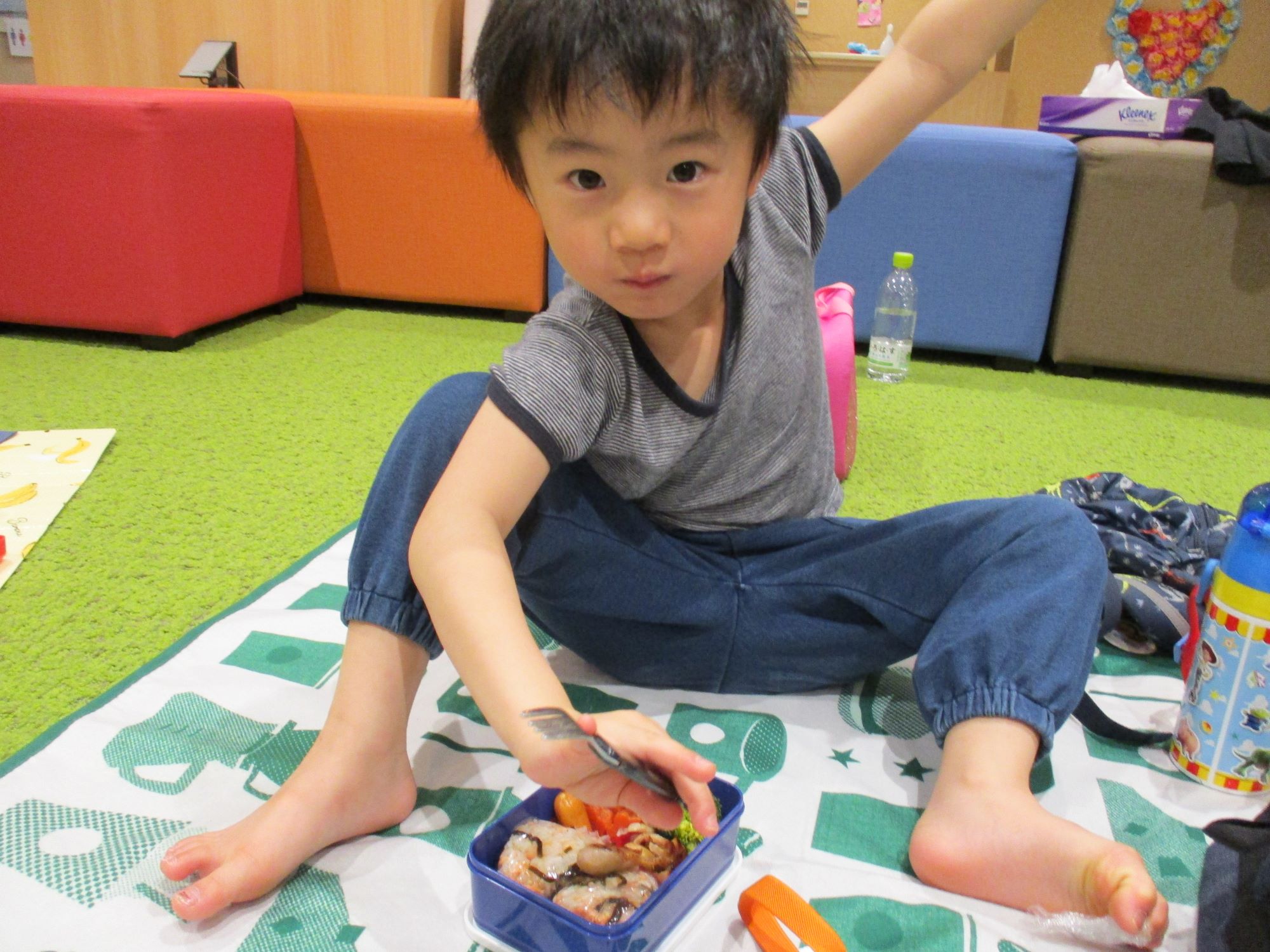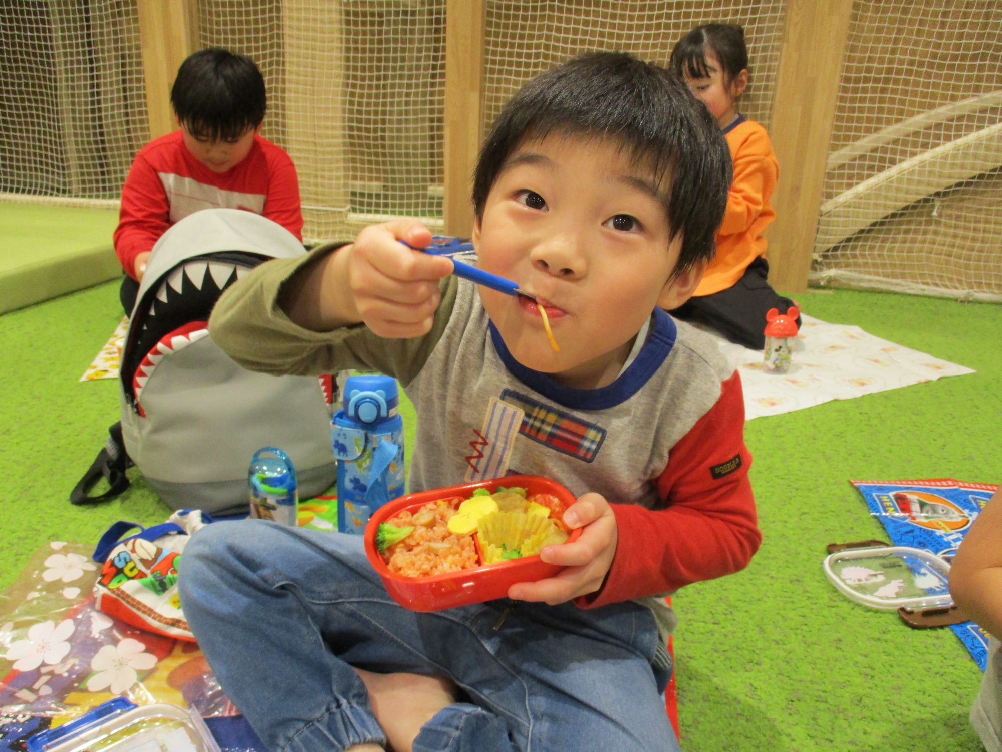 3.4歳のお兄さんお姉さんはお弁当を持って来て、保育園外でのご飯を楽しみました。