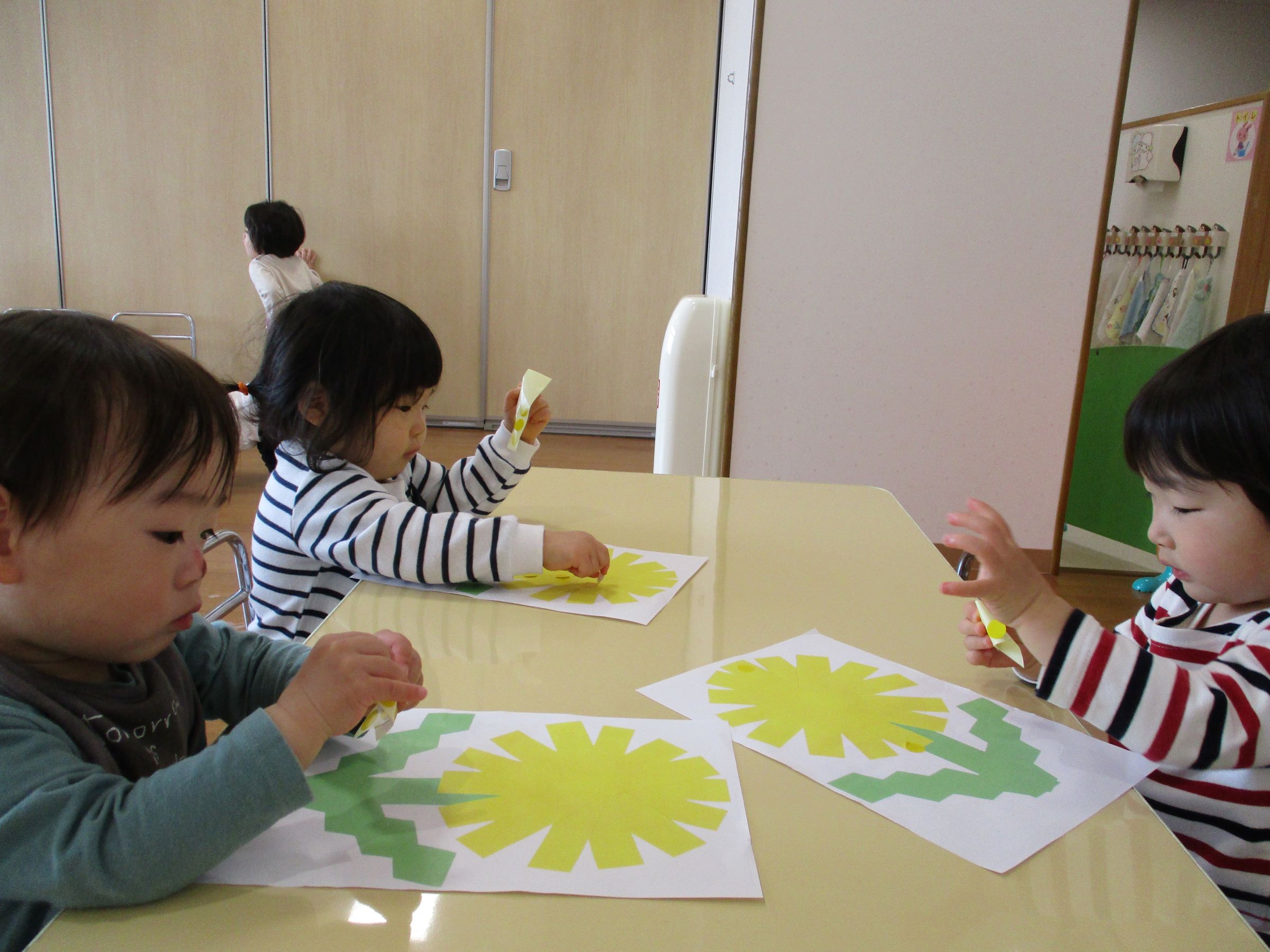 みんなの大好きなタンポポの絵にシールを貼って遊んでみましたよ!