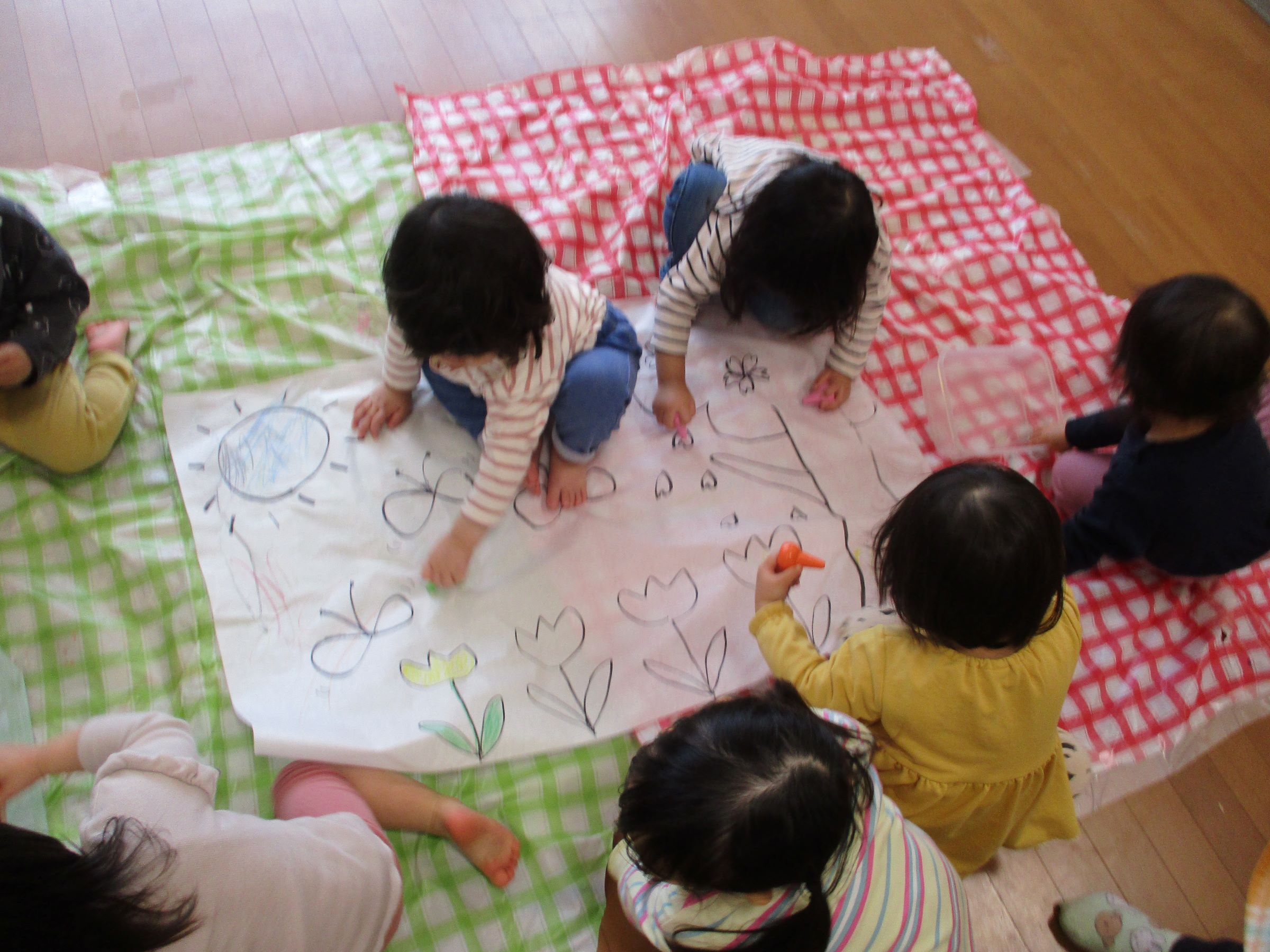 朝の会で歌う「ちょうちょう」「チューリップ」を大きな画用紙に描き