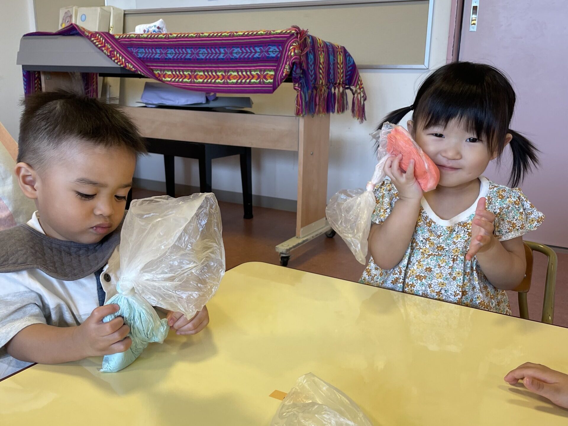 小麦粉粘土は冷蔵庫で冷やしておき、冷たさとむにむにの感触を経験しました。