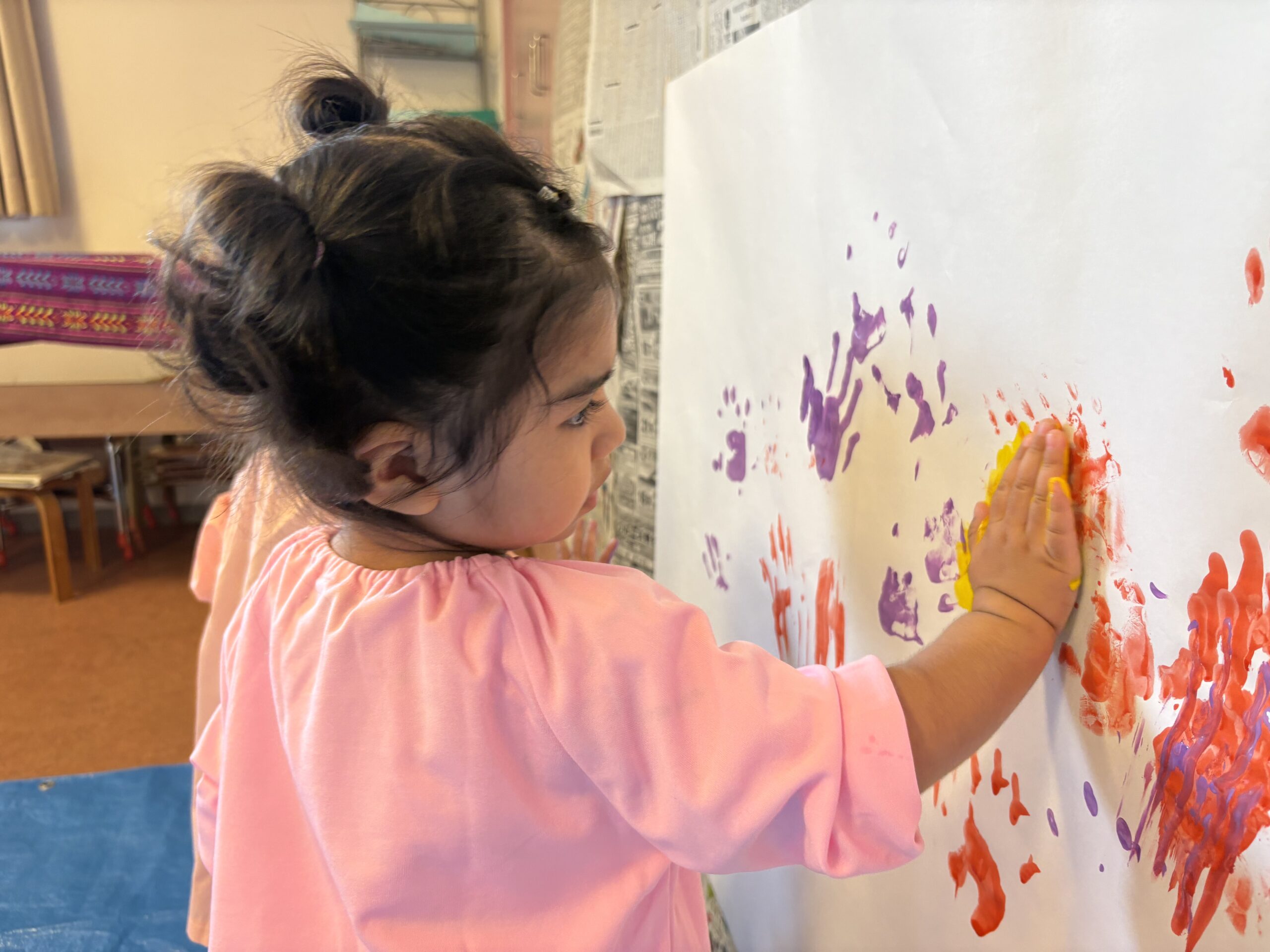 絵の具あそびでは、大きな紙に塗り広げたり、手形を付けて楽しみました。