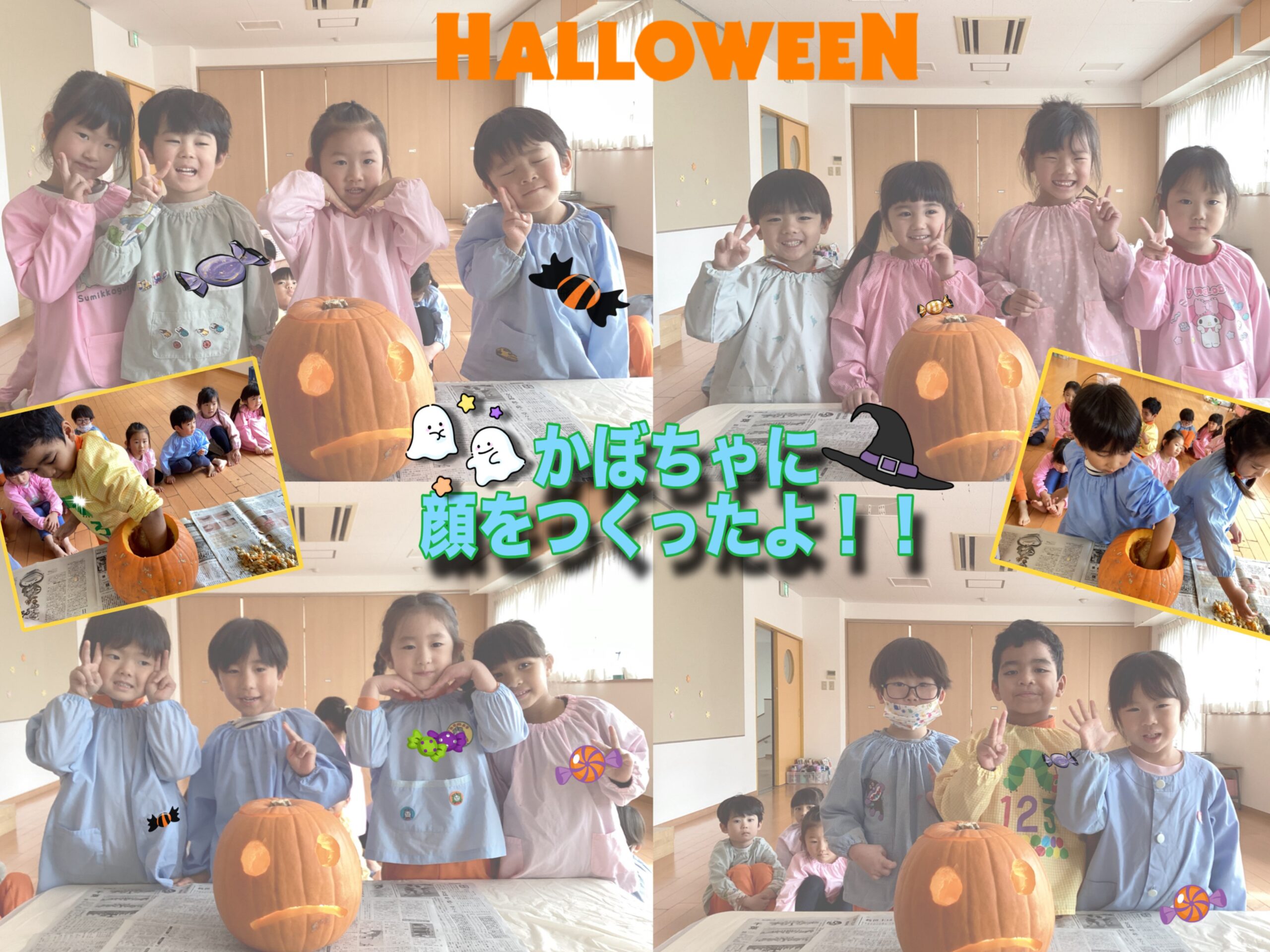 10月のハロウィンで飾っていたかぼちゃを、みんなで考えた目と口の形にくり抜きました。