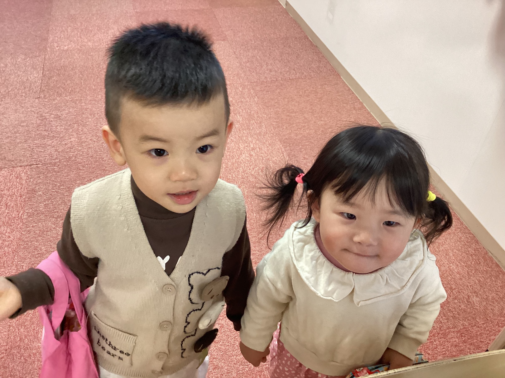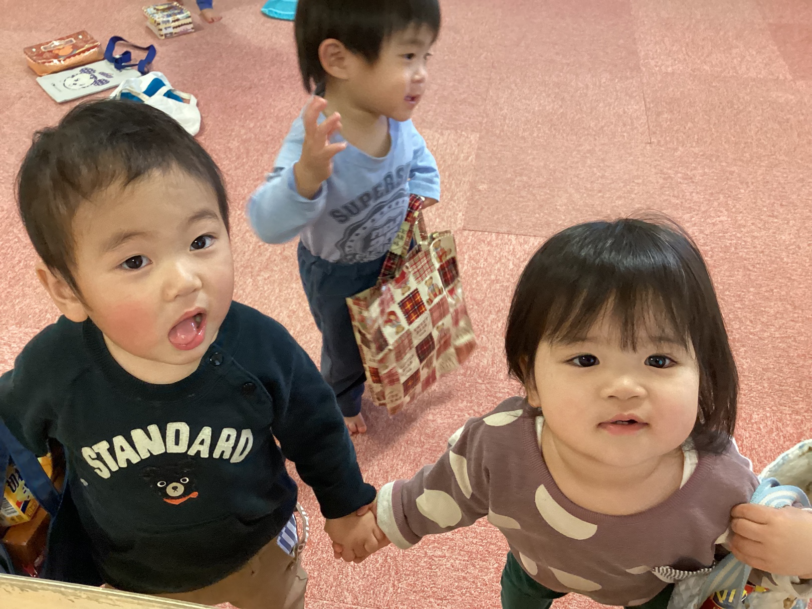 お菓子の空箱を袋に詰めてお買い物!「ピッ!」と言ってお会計をする姿もあります😄💕手を繋いで一緒にショッピングを楽しむももさんです!もも組で過ごすのも残りわずかとなりました。毎日にこにこで過ごしていきたいと思います!