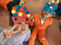 製作したお面をかぶって、悪い鬼をやっつけました。