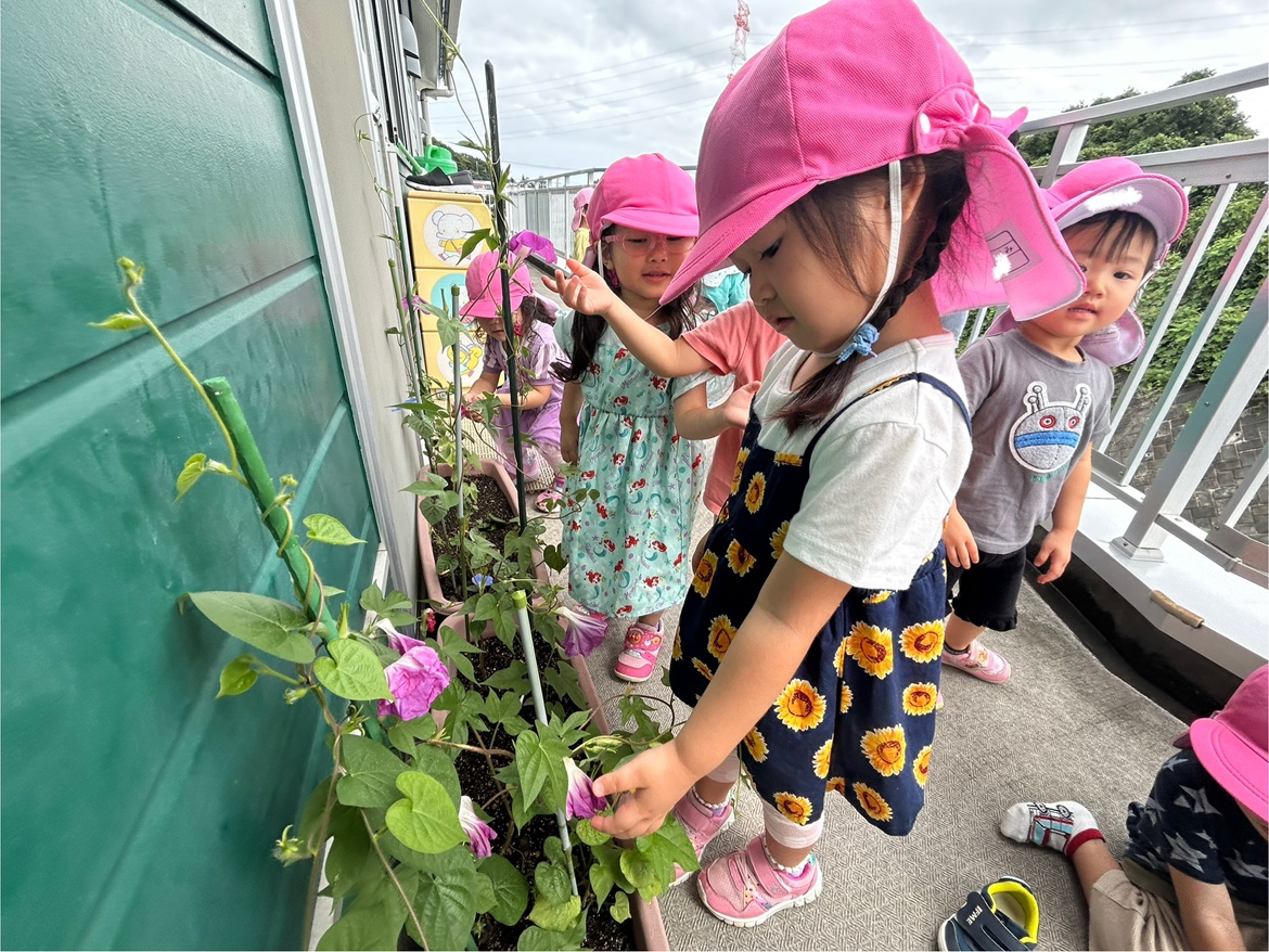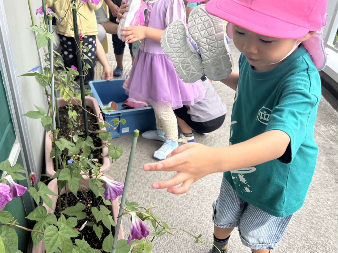実際に咲いた花を見ると「紫だね~」「青もある!」と朝顔の観察を