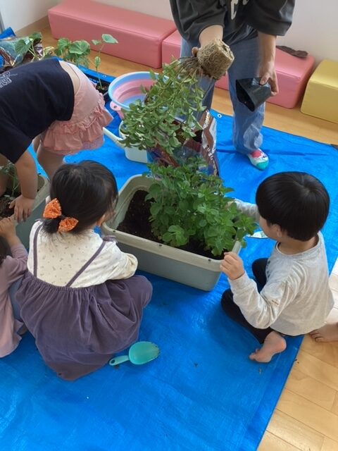ペンギン・イルカ・クジラ組のみんなでプランターで苗植えをしました。