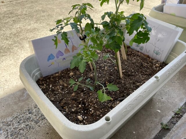 苗植え後は、葉の絵を描き、プランターのプレートにしました。