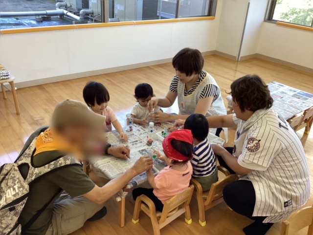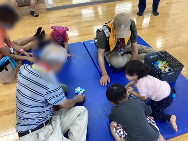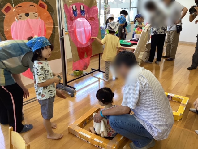 チョコバナナ屋、スーパーボールすくい、野菜的あて、エコ創作の4つのブースがあり、子どももおじいちゃん、おばあちゃんも一緒に楽しんでいました。