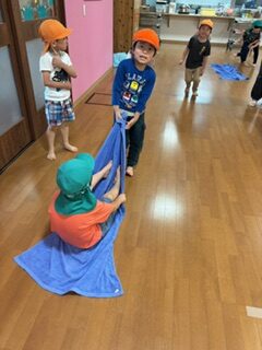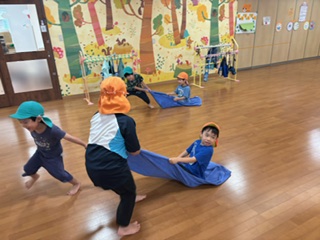 一人はタオルの上に座り、一人はタオルを引っ張って進む遊びで、子ども達はどう引っ張れば進みやすいか、どんな座り方が良いかを考えていました。