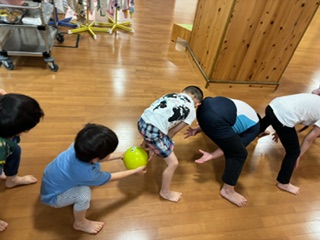 一列に並びボールを順番に頭の上を通したり、足の下を通したりして遊びました。