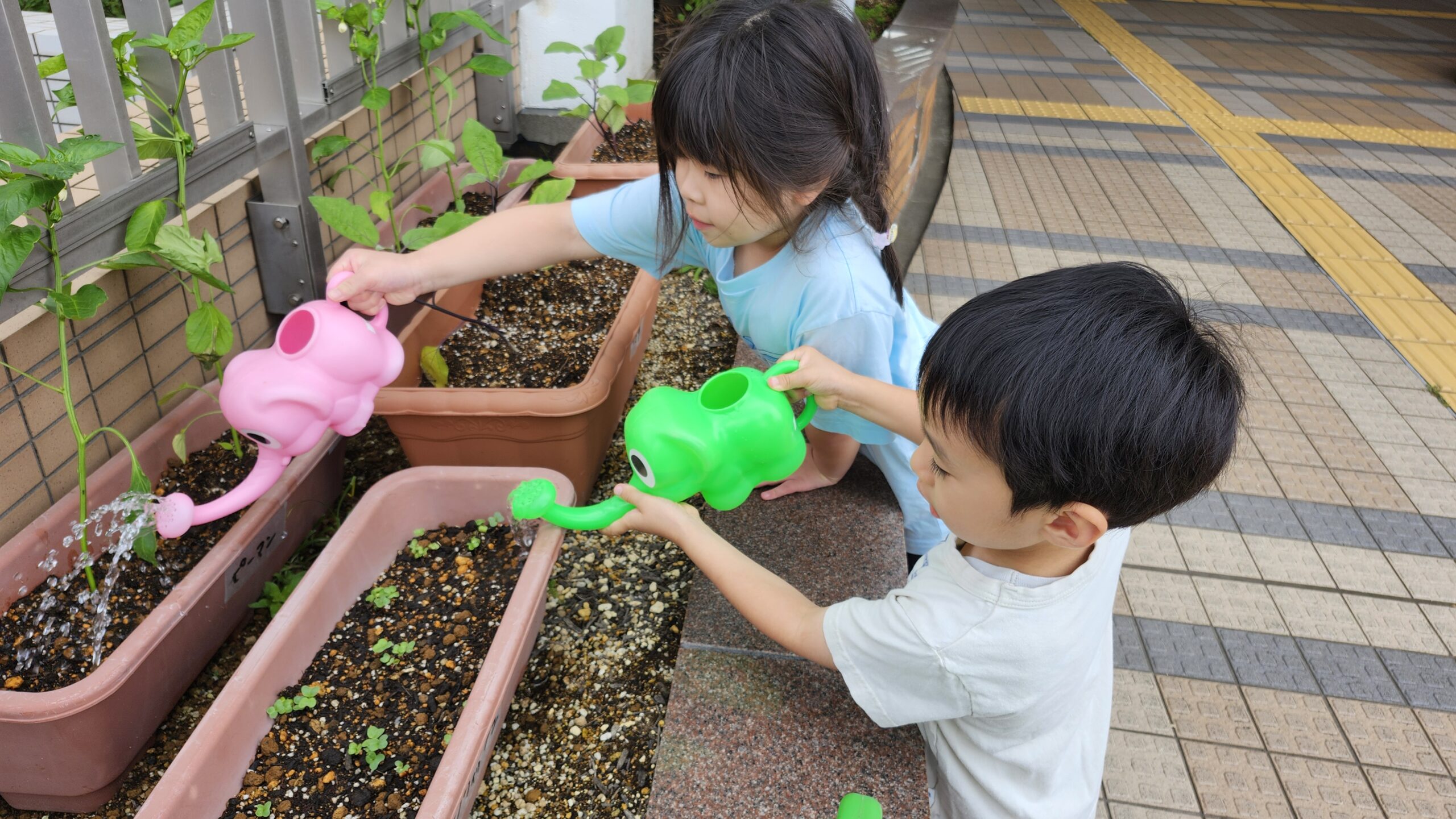 お友達と協力して土を掘り、優しく苗を置いて土のお布団をかけるといったことも上手にできましたよ。