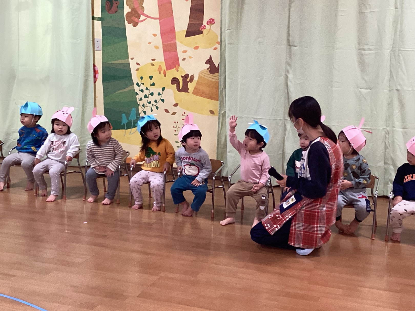 1歳児は手遊びやダンスを行い、2歳児はみんな大好きはらぺこあおむし、3~5歳児はリトミックやダンス、合唱等の発表をしました。