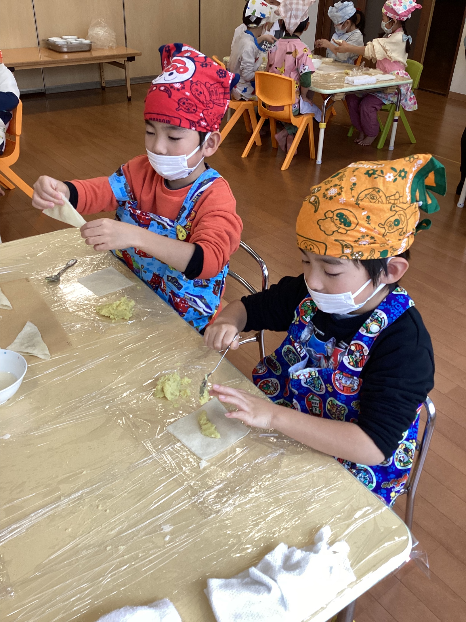 今週は以前収穫したさつまいもを使って三角スイートポテトパイを作りました。
