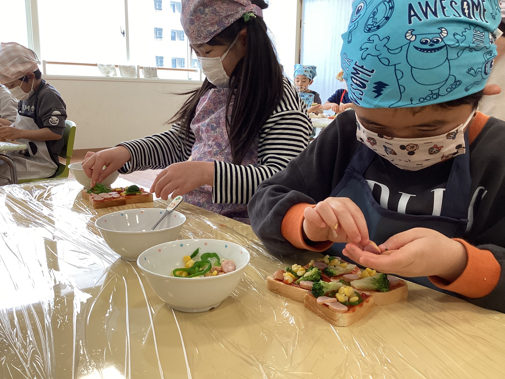 クッキングが始まるとたくさんの具材がある中、コーンやウインナーを使って顔を作ったり、